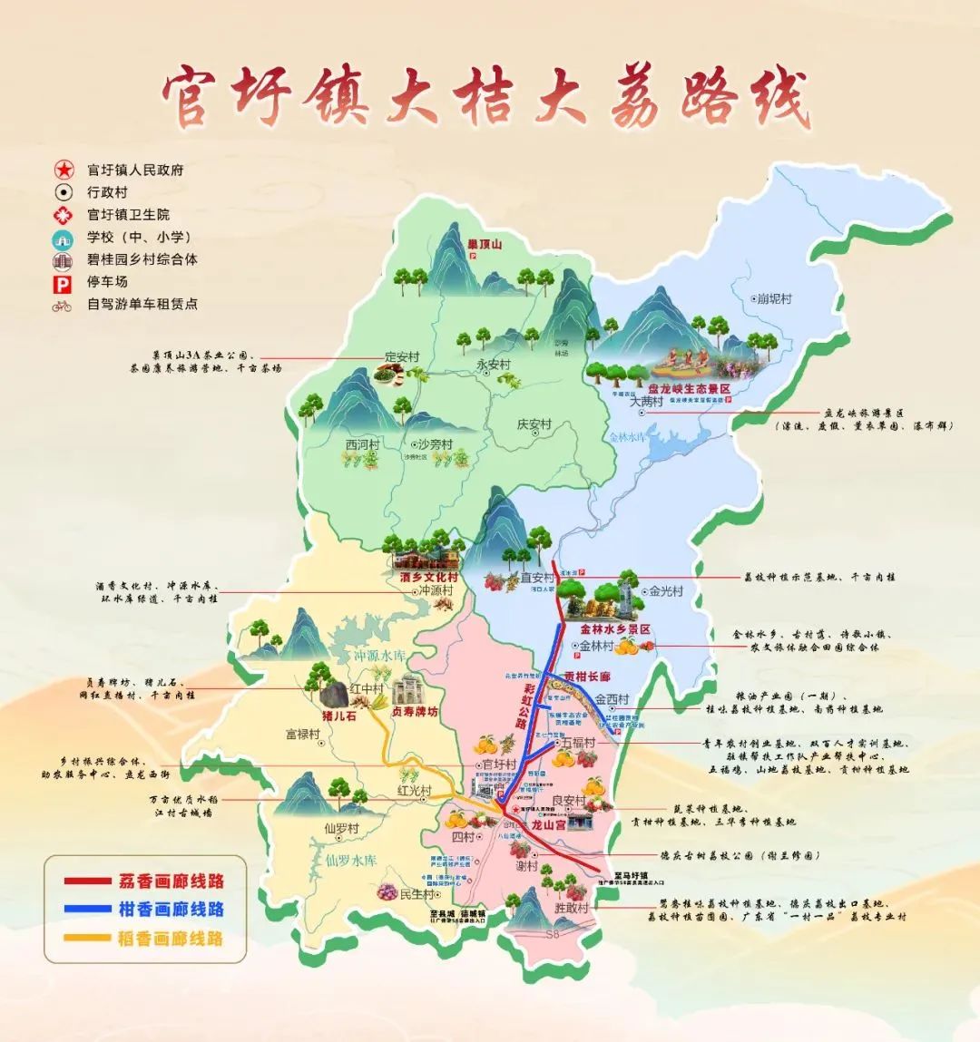 线路包括柑香画廊、荔香画廊两大类,位于德庆县贡柑、荔枝主产区——官圩镇和马圩镇,与德庆县省级新农村示范片相融合。