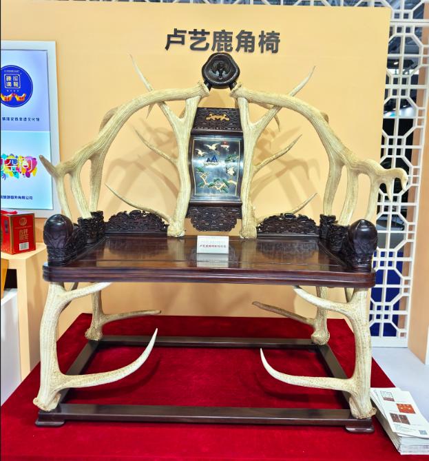 △茅龙笔与卢艺鹿角椅。居住在广州的李先生对江门展馆展出的卢艺鹿角椅、茅龙笔十分感兴趣,他说:“过去我对江门的了解不多,看到展出的非遗产品,让我对这座城市独特的侨乡文化心生向往,有机会一定要去江门走走看看!”