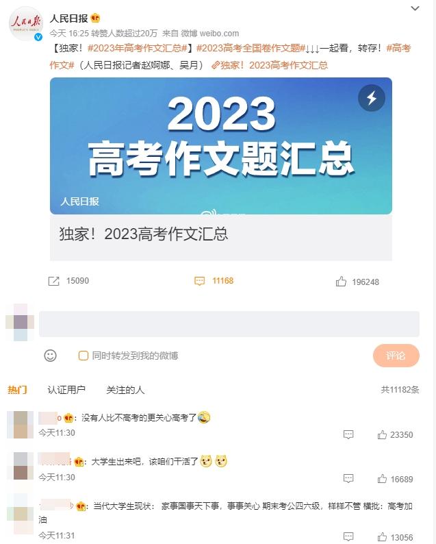 而高考词条中的语文作文,更是每位网友们逃不开的话题。不到一天,和高考作文相关的微博,就达成了评论上万,点赞十几万的成就。