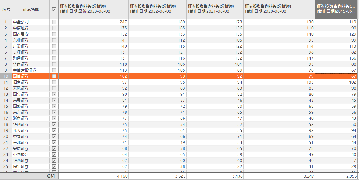 近年来,随着业务的拓展,券商分析师数量逐年上升。Choice数据显示,截至6月8日,全国共计4160名证券投资咨询业务(分析师),比2019年同期的2995名增加1165名。当前,中金公司分析师数量为247,行业排名第一;中信证券、国泰证券、兴业证券、广发证券、长江证券、海通证券、华泰证券、中信建投、国信证券分析师数量紧随其后,均超过100。