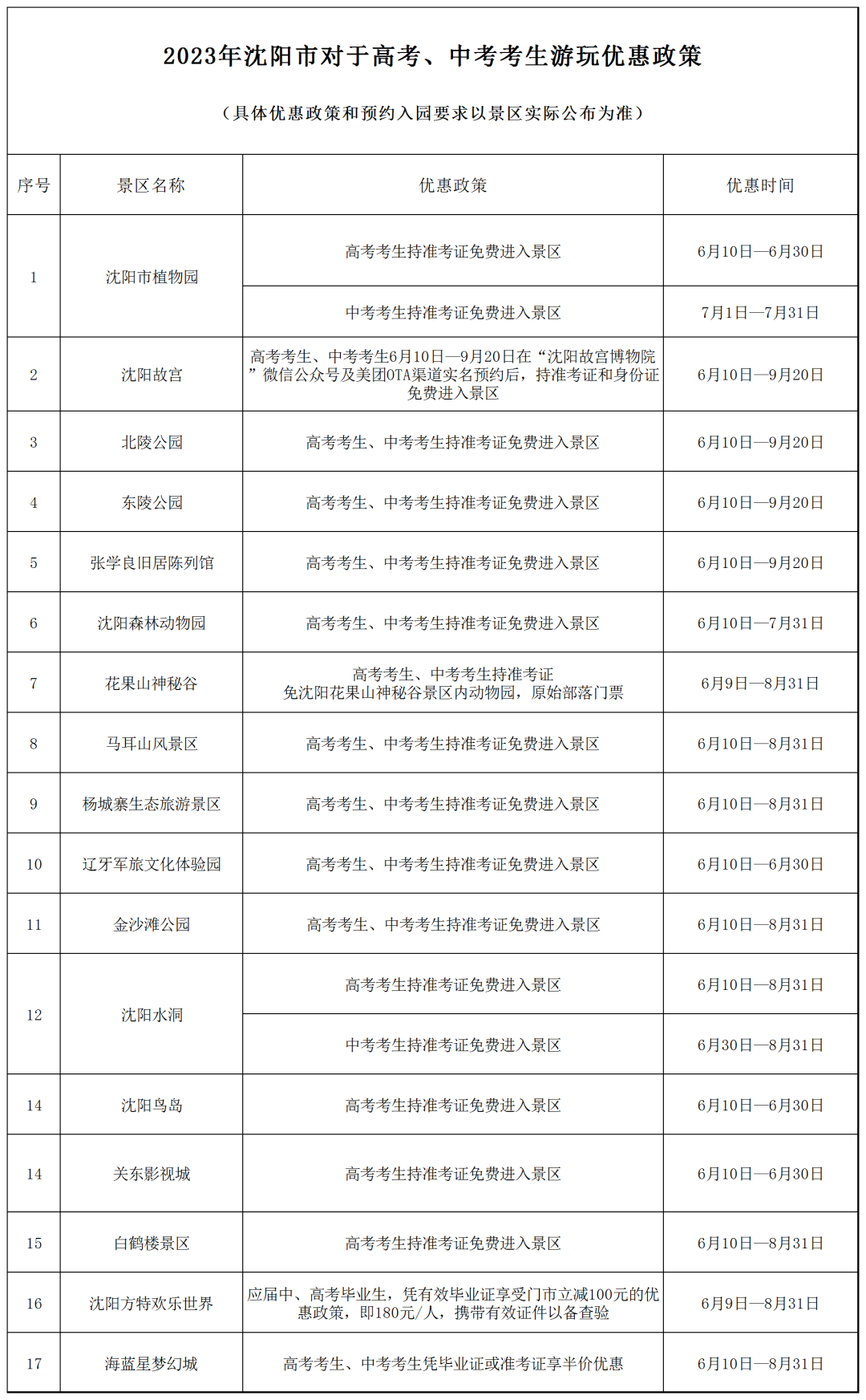沈阳发布中、高考生游玩优惠政策,17个景点减免门票