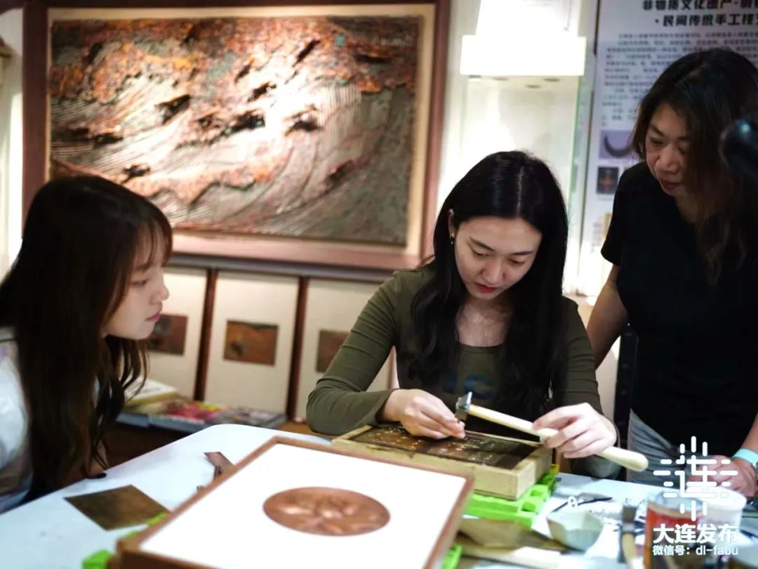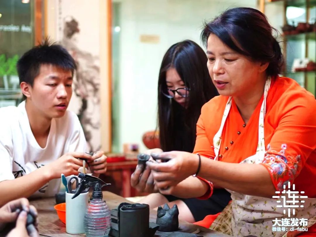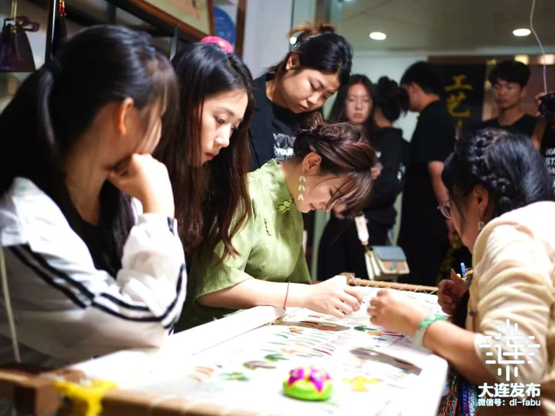 活动当天,30余名来自辽宁轻工职业学院和大连外国语大学国际艺术学院的学生也首次来到了活动现场。在鉴赏艺术作品的同时,学生们还在非遗大师的指导下进行了互动体验,特别的非遗课堂,让他们大开眼界。