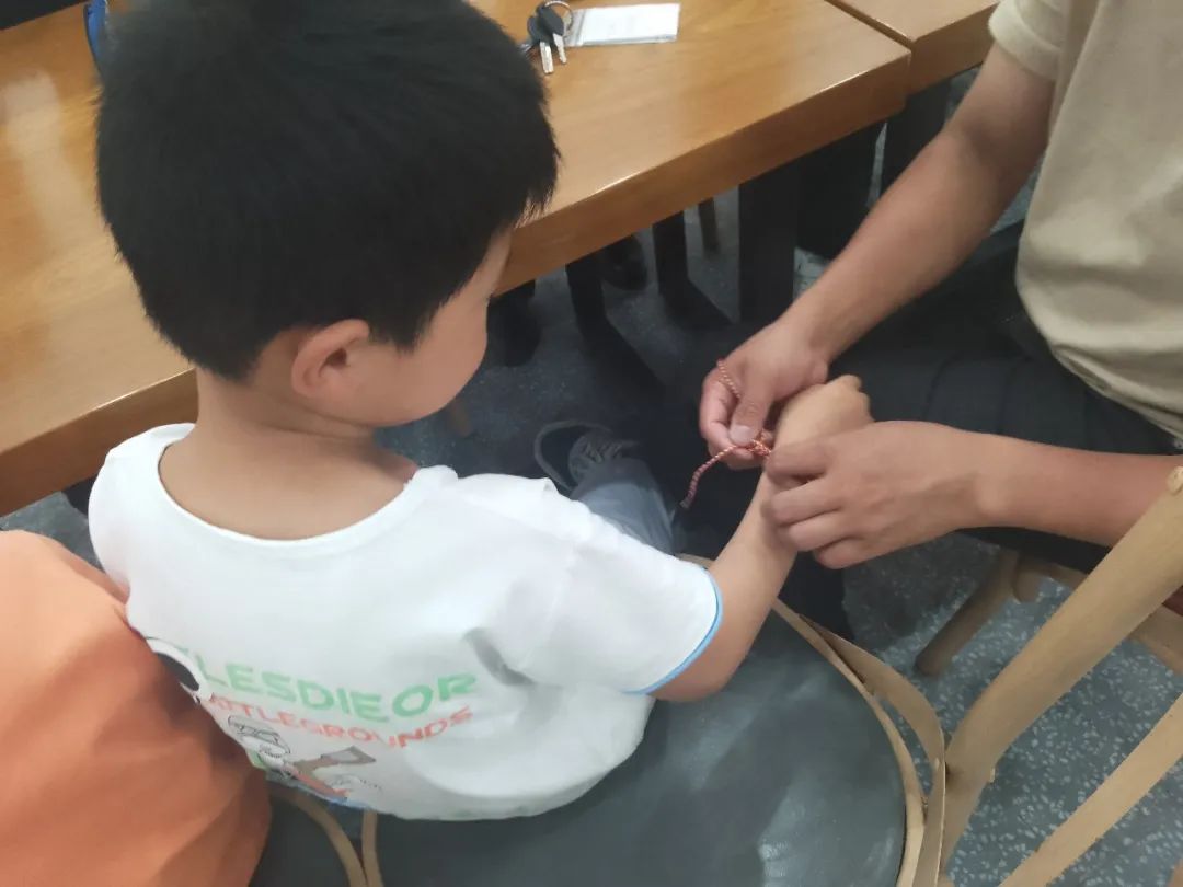 五彩绳一般是由青色、白色、红色、黑色、黄色组成,代表“金木水火土、东西南北中”。自古,在端午节佩戴五色丝线有辟邪,兼有祈福纳吉的美好寓意。小朋友们在家长的帮助下编制一根五彩丝线手环。