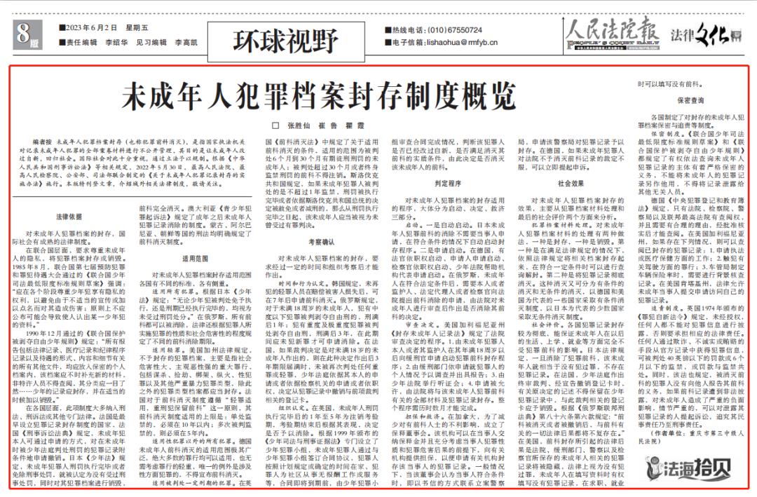 刊载于2023年6月2日 《人民法院报》第八版编者按 未成年人犯罪档案封存(也称犯罪前科消灭),是指国家执法机关对记录未成年人犯罪的全部案卷材料进行不公开管理,其目的是让未成年人改过自新,回归社会。国际社会对此十分重视,通过立法予以规制。根据《中华人民共和国刑事诉讼法》等相关规定,2022年5月30日,最高人民法院、最高人民检察院、公安部、司法部联合制定的《关于未成年人犯罪记录封存的实施办法》施行。本版特刊登文章,介绍域外相关法律制度,敬请关注。