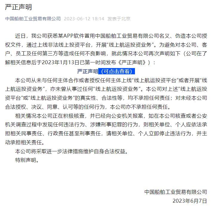 6月12日,中国船舶工业贸易有限公司微信公众号发布“严正声明”。