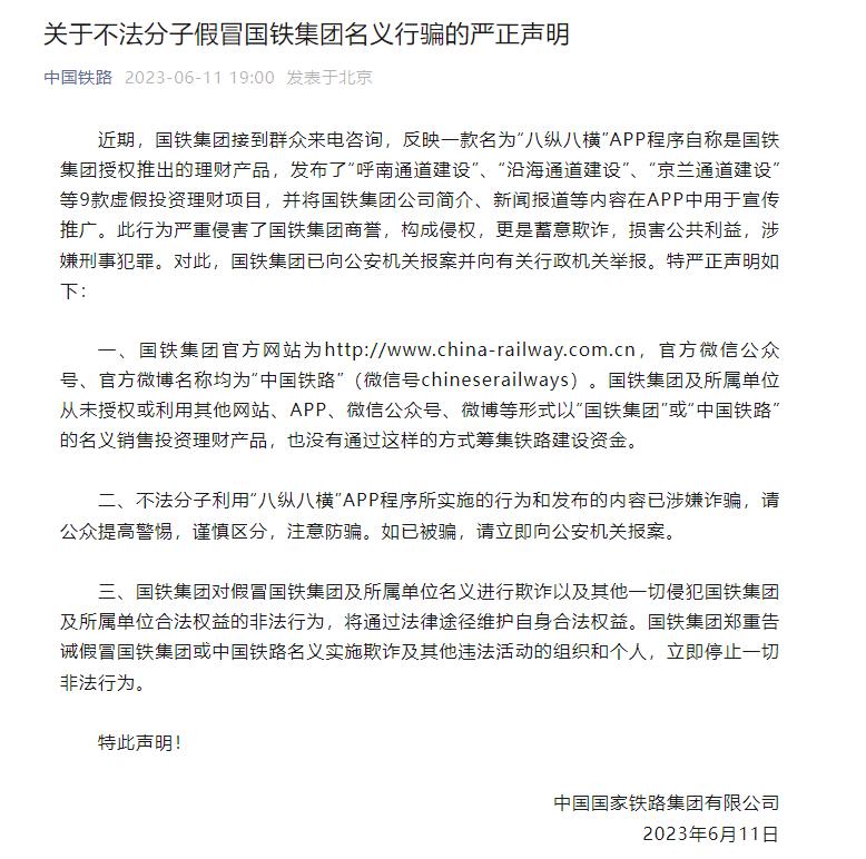 声明称,近期,国铁集团接到群众来电咨询,反映一款名为“八纵八横”App程序自称是国铁集团授权推出的理财产品,发布了“呼南通道建设”“沿海通道建设”“京兰通道建设”等9款虚假投资理财项目,并将国铁集团公司简介、新闻报道等内容在App中用于宣传推广。此行为严重侵害了国铁集团商誉,构成侵权,更是蓄意欺诈,损害公共利益,涉嫌刑事犯罪。对此,国铁集团已向公安机关报案并向有关行政机关举报。
