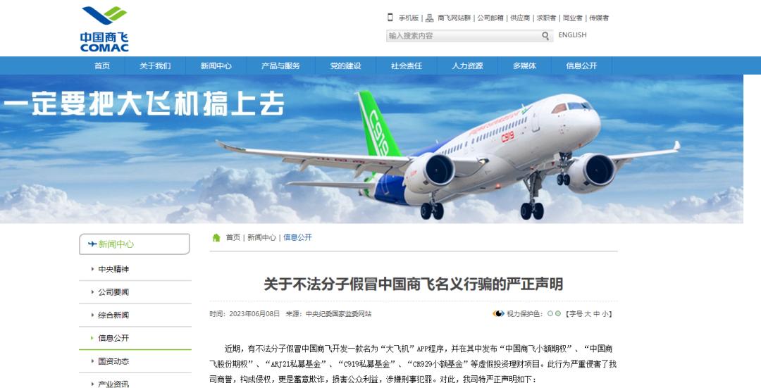 6月8日,中国商飞官网发布“关于不法分子假冒中国商飞名义行骗的严正声明”。