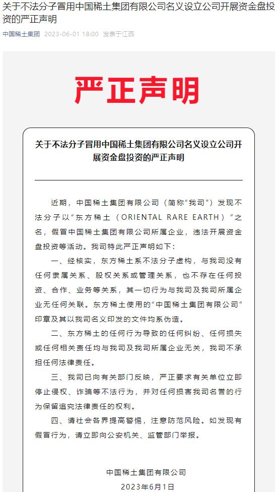 6月1日,中国稀土集团有限公司微信公众号“中国稀土集团”发布“关于不法分子冒用中国稀土集团有限公司名义设立公司开展资金盘投资的严正声明”。