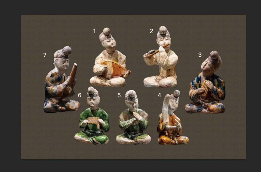 横笛、笙、排箫、筚篥、琵琶、拍板、箜篌,这七件乐器中既有西域传来的,也有中国传统的,还有“中西结合”的。比如1号乐师横抱着弹奏的西域胡琵琶,在传入中原后与中原的乐器阮相结合,就形成了如今的中国的传统乐器琵琶。