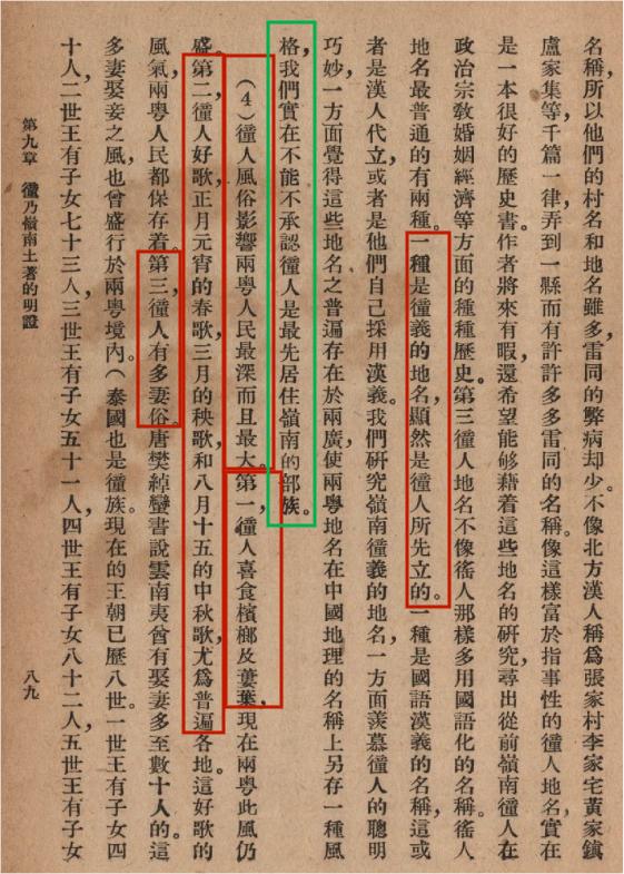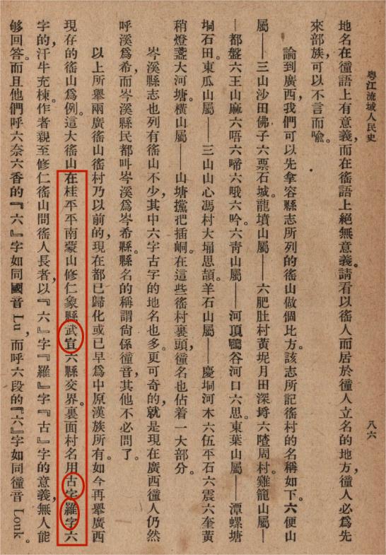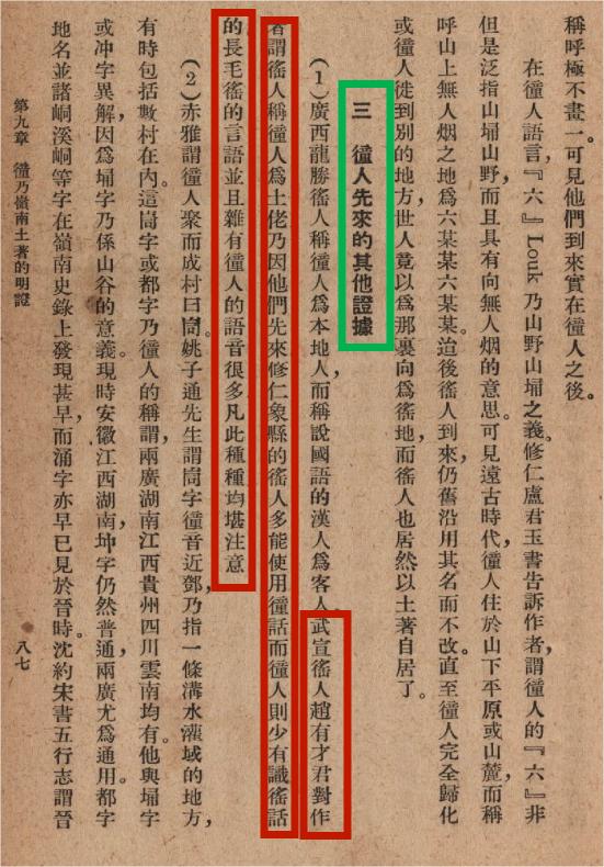 民国《广西地理》“第九章,徸乃岭南土著的明证:武宣徭人赵有才君对记者谓,徭人称徸人为土佬,乃因他们先来”“徭人到两广乃在徸人之后”还有很多地名带有壮义的,“武宣等县村名用用古字、罗字、六字的”“徸人好歌,正月元宵的春歌、三月的秧歌、八月十五的中秋歌尤为普遍”