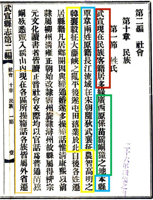 民族融合已经分不出土著《武宣县志》有这样记载:“武宣现在民族客籍居多,缘广西原係苗猺峒獞之地,本县覃韦两姓原籍长江流域,在宋朝随狄武襄征农智高,明之韩襄毅征大藤峡之乱,平后遂屯田落业于此,自后各姓迁居县籍。凡居乡开因与獞通婚遂多操獞话……现在各区所操獞话各族皆属外省迁来,乃以汉族随操獞话,实无真正獞族,故武宣民族以覃韦两姓入籍为最先,其余各姓多系明清迁居。”