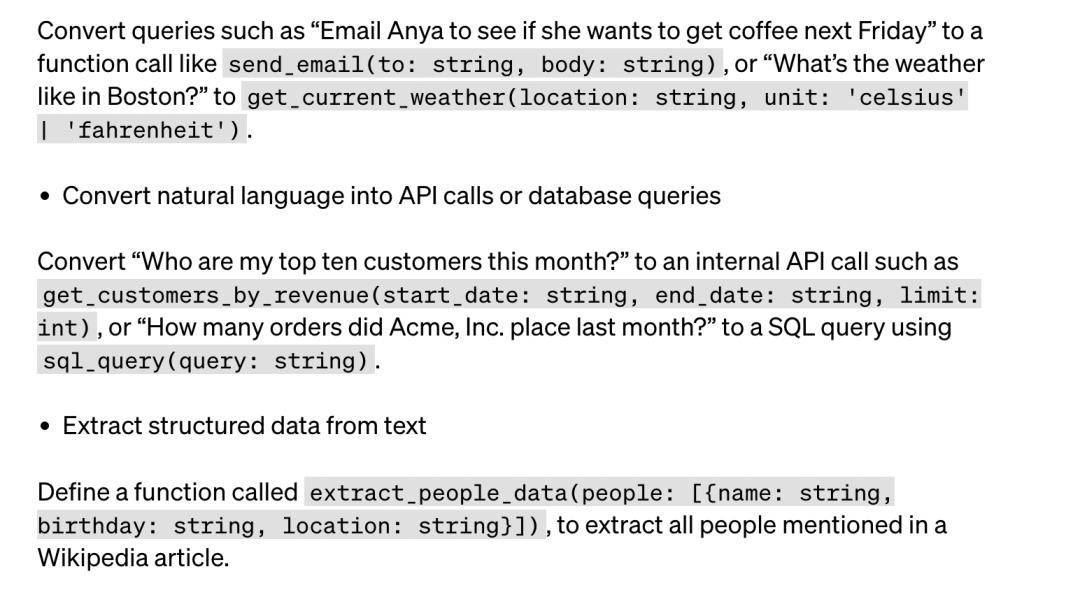 举一个简单的例子,开发者通过与聊天机器人“对话”,GPT随后能够知道何时要需要用外部工具来解决问题,即GPT可以将自然语言转换为数据库查询,并从文本中提取结构化数据,而不再需要开发者花费大量时间对其输入相关描述内容,同时,这也将进一步提升GPT的正确率。OpenAI此次还发布了gpt-4-0613和gpt-3.5-turbo-0613改进模型,两者均支持函数调用功能。