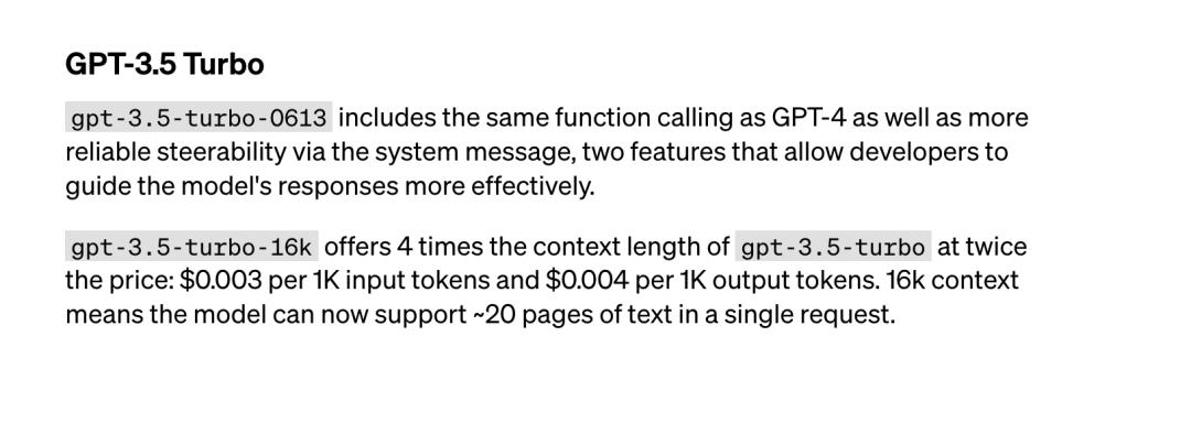 除了函数调用功能之外,OpenAI 还发布了gpt-3.5-turbo-16k模型。此前,由于使用者输入的文字内容过长,生成式AI模型往往会“忘记”一部分人机对话窗口的内容,从而导致生成的内容偏离主题,而GPT-3.5-turbo解决了该问题。