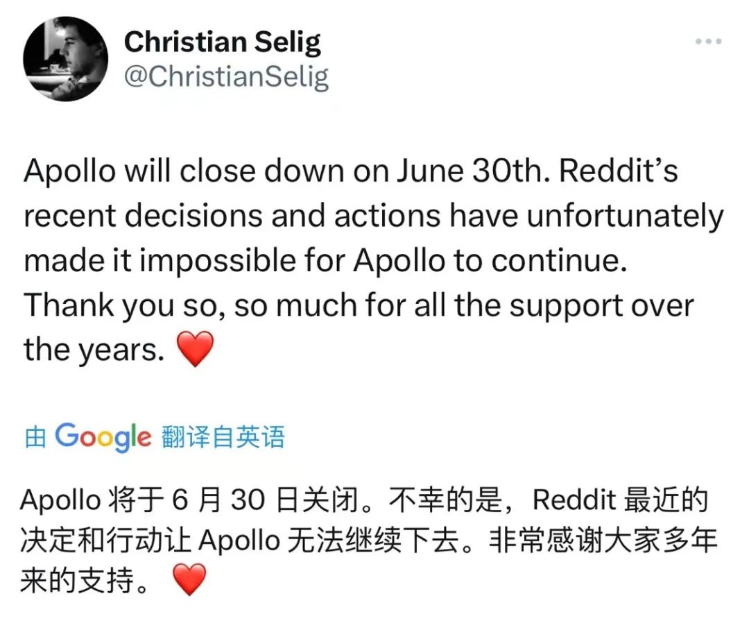 跟 Reddit 的谈判失败后,Apollo 的开发者 Christian Selig 直接表示 6 月底就把平台给关了。