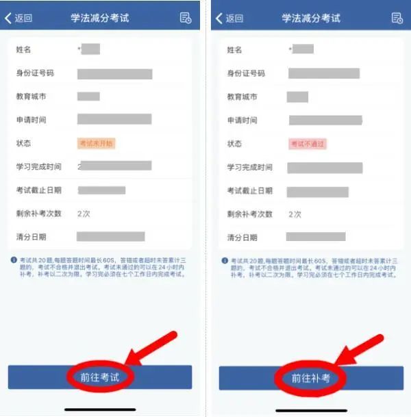■ 在已经完成学习的情况下,点击“前往考试”进入考试,如之前考试没通过且剩余考试次数还有的情况下,点击“前往补考”进入补考。