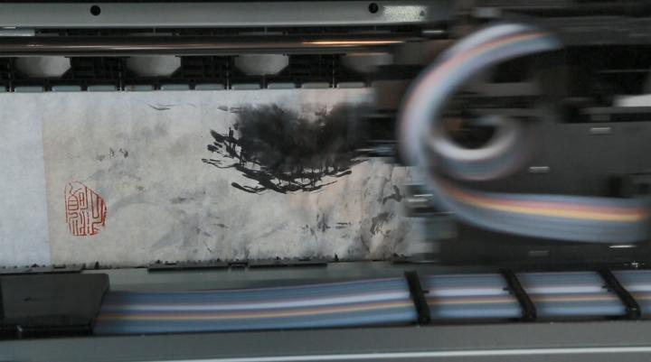 一台体型庞大的打印机,不时地发出“唰”的声音,只用15到30分钟,一幅泼墨山水画便印在了薄如蝉翼的宣纸上。