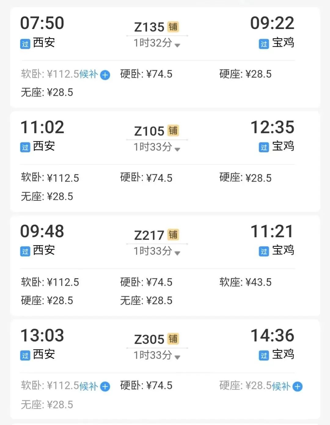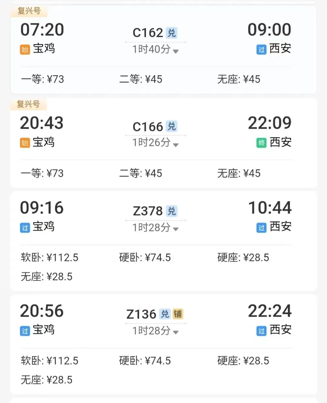 例如:从宝鸡出发,到西安站下车,最快1小时40分到达。↓↓↓