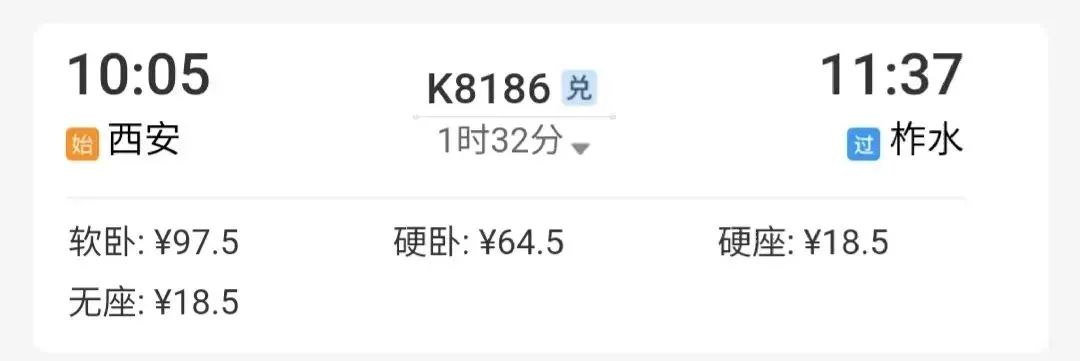 例如,从西安出发,到柞水站下车,1小时32分到达。↓↓↓