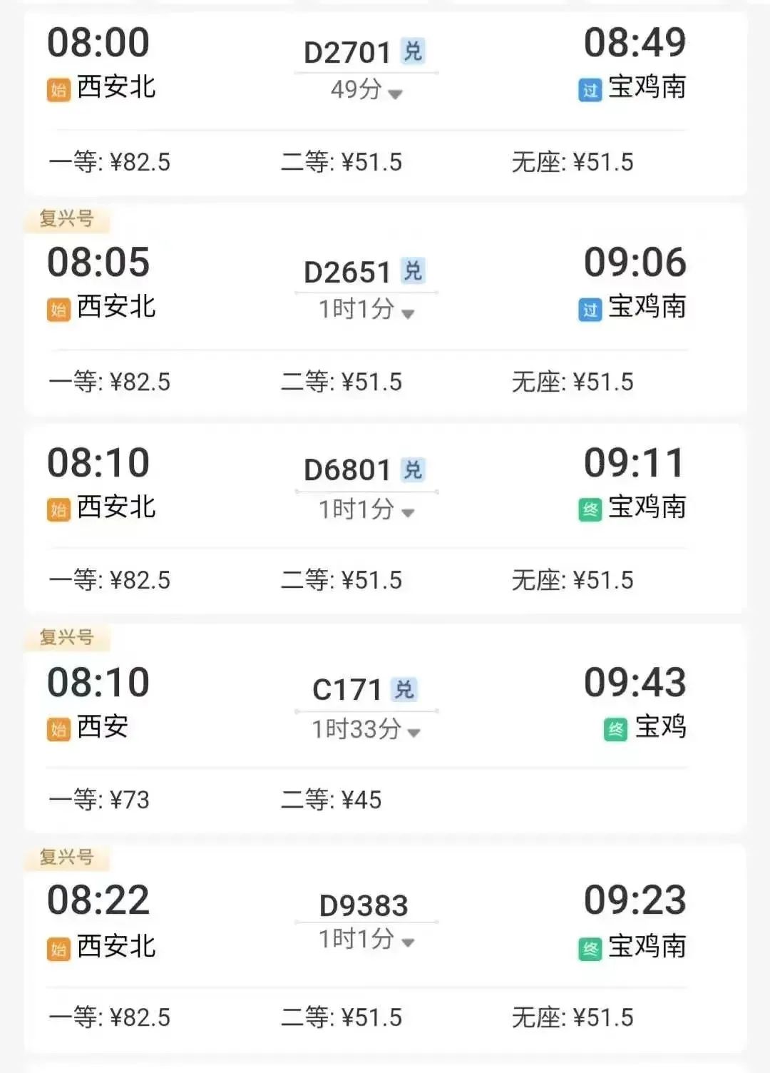 例如,从西安北出发,乘坐到宝鸡南站的动车,最快49分钟到达。↓↓↓