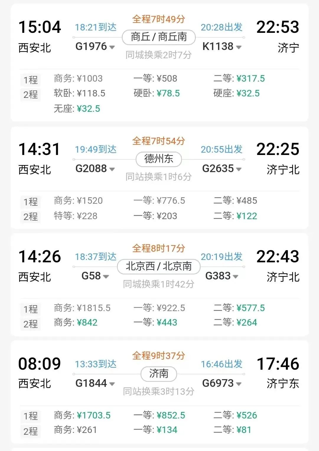 例如,从西安北出发,到商丘站下车换乘到济宁的火车即可到达。↓↓↓