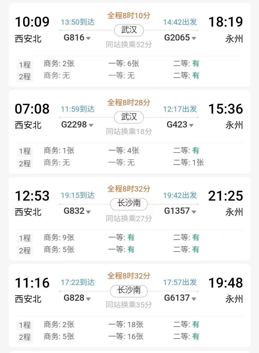 例如,从西安北出发,乘坐动车到武汉站下车,再换乘到永州的动车,最快9小时47分到达。↓↓↓