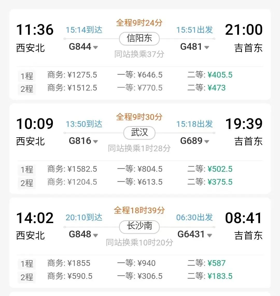 例如,从西安北出发,乘坐动车到信阳东站下车,换乘到吉首东的动车,最快9小时24分钟到达。↓↓↓