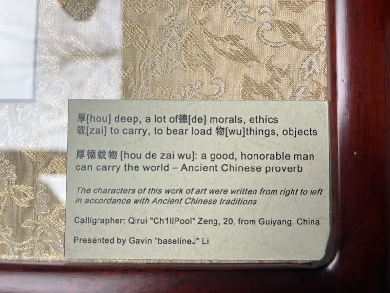 这份特殊礼物的制作者包括三人:负责书法写作的是就读于孔圣人故乡山东曲阜师范大学书法专业的曾麒睿同学,自幼学习并且热爱书法的他是一位CS的忠实粉丝,是ZywOo两届TOP1比赛秀的见证者。负责礼物寄送的是身为UP主的小萌哥,众所周知CSGO这款游戏玩世界服或者获取第一手的赛事资讯都需要很多的英语知识,这位UP主的视频对于CSGO玩家提升英语实力显然是有帮助的。书法作品当然离不开印章,负责印章制作的是安徽师范大学的啊庆同学。