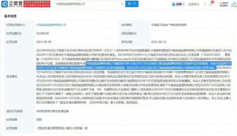 处罚事由显示,执行人员调查发现,当事人曾于2022年11月邀请港台负面艺人孙兴参加其举办的营业性演出。酒吧负责人承认邀请孙兴参加店庆,并称孙兴主要是与大家打招呼、演唱了一首歌,并且切了蛋糕,整个过程20多分钟,没有收演出门票,给孙兴包了2万元的红包并报销来回路费。
