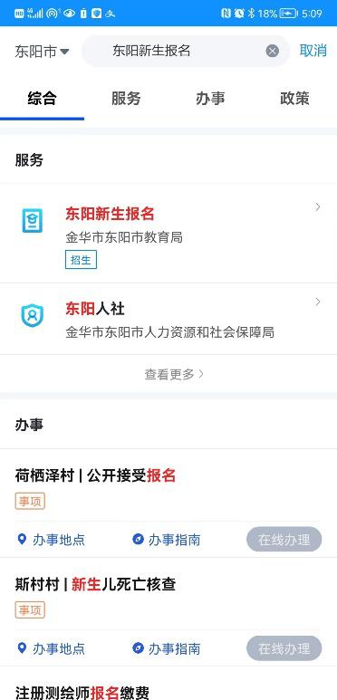 3.切换到东阳市并搜索“东阳新生报名”或者“东政通”