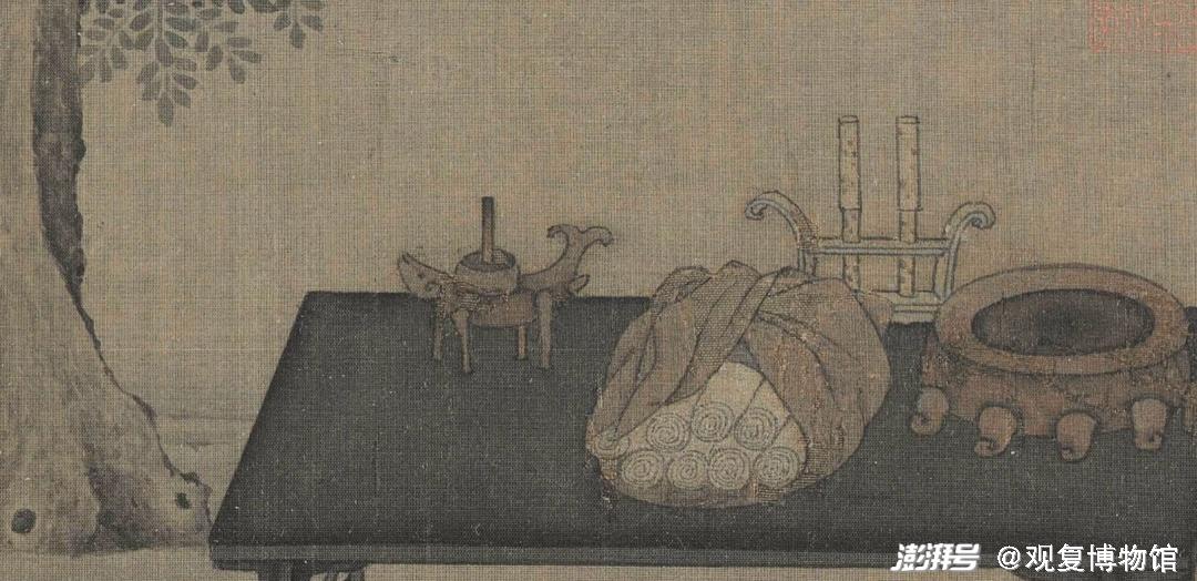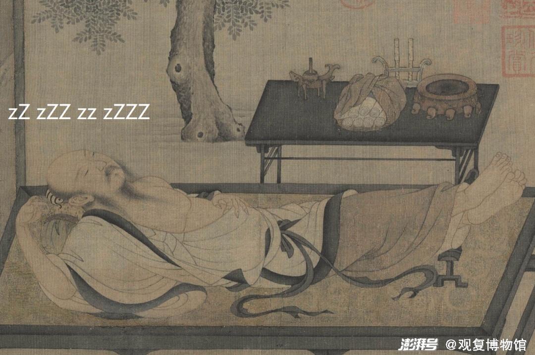 盛夏庭院,槐树的浓荫下,高士半解上衣,恬然入睡。从榻边条案上摆放的香炉、烛台、书卷等物品来看,这位高士大概是在树荫下伴着熏香读书赏画,困了便倒头就睡。此番夏日生活相当安逸舒服。
