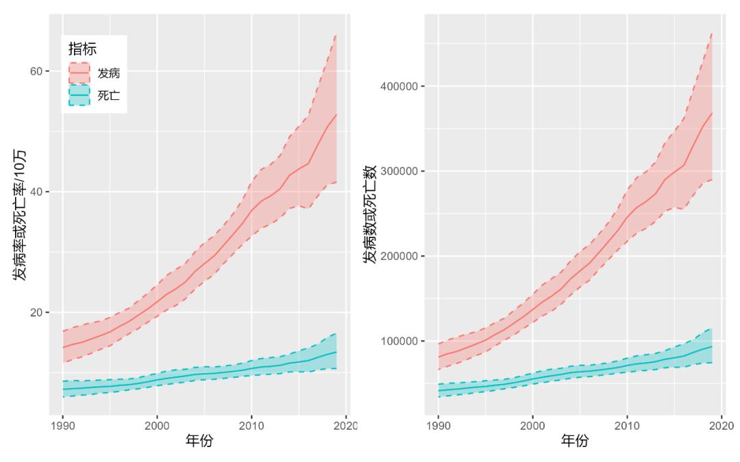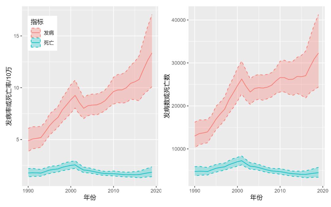 △ 中国全人群乳腺癌发病率、死亡率随年份的变化趋势(制图:林水瑶,下同)这意味着,未来将有越来越多年轻乳腺癌患者将带病生存。