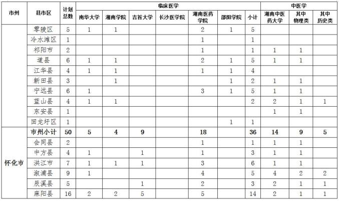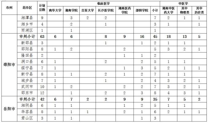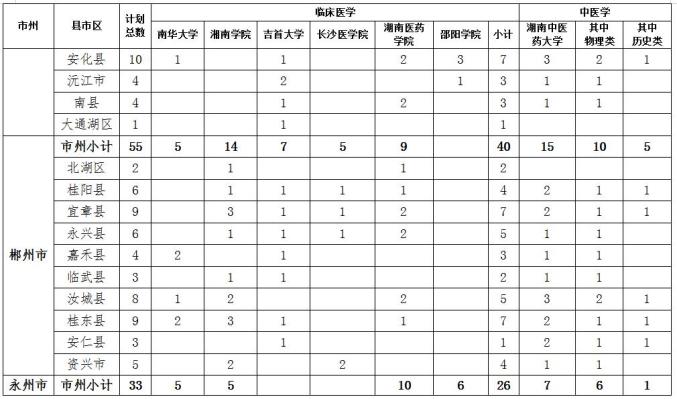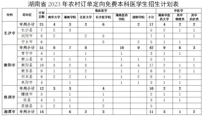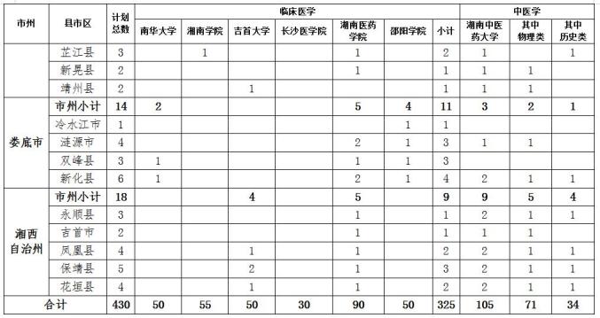 2023年我省定向医学生招生计划为430人,其中,临床医学专业招生325人、中医学专业招生105人。临床医学专业培养高校及招生计划为南华大学50人、吉首大学50人、湘南学院55人、长沙医学院30人、湖南医药学院90人、邵阳学院50人;中医学专业培养高校及招生计划为湖南中医药大学105人。上述招生计划均纳入各培养高校年度招生总计划。