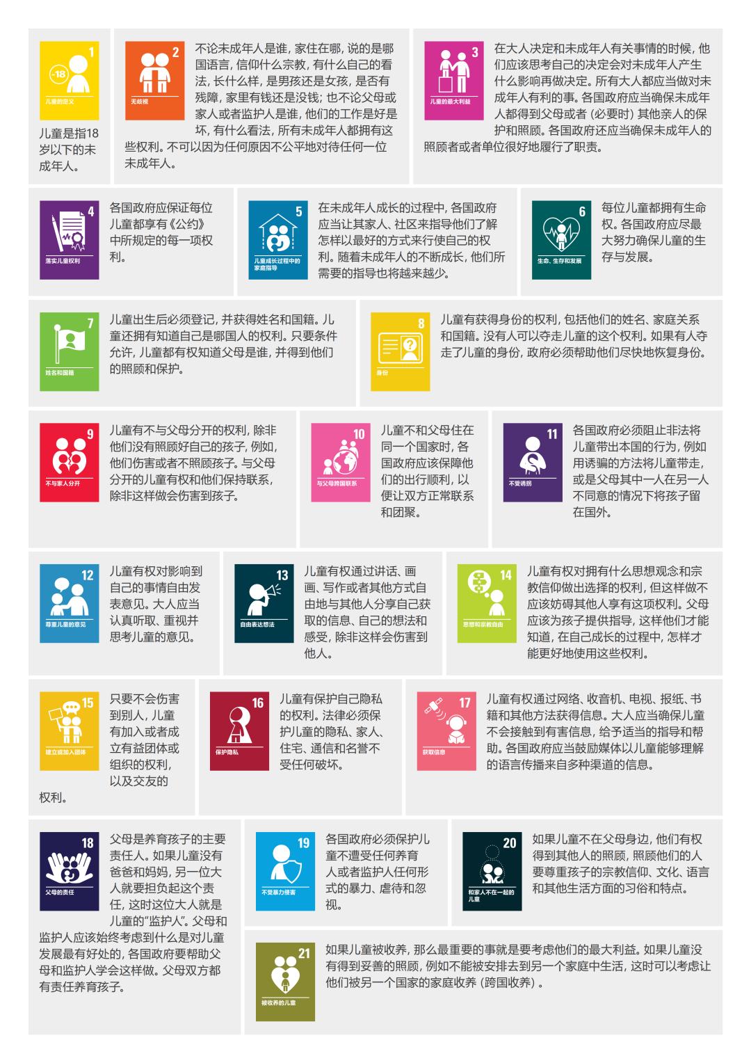 不论未成年人是谁,家住在哪,说的是哪国语言,信仰什么宗教,有什么自己的看法,长什么样,是男孩还是女孩,是否有残障,家里有钱还是没钱;也不论父母或家人或者监护人是谁,他们的工作是好是坏,有什么看法,所有未成年人都拥有这些权利。不可以因为任何原因不公平地对待任何一位未成年人。