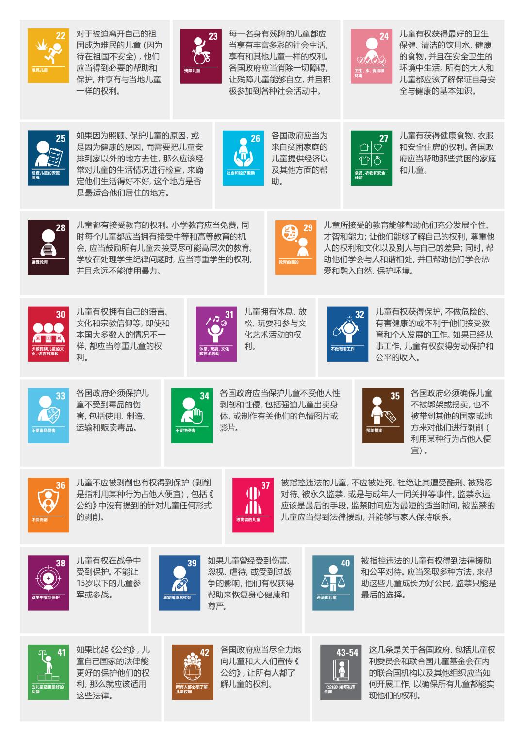 这几条是关于各国政府、包括儿童权利委员会和联合国儿童基金会在内的联合国机构以及其他组织应当如何开展工作,以确保所有儿童都能实现他们的权利。