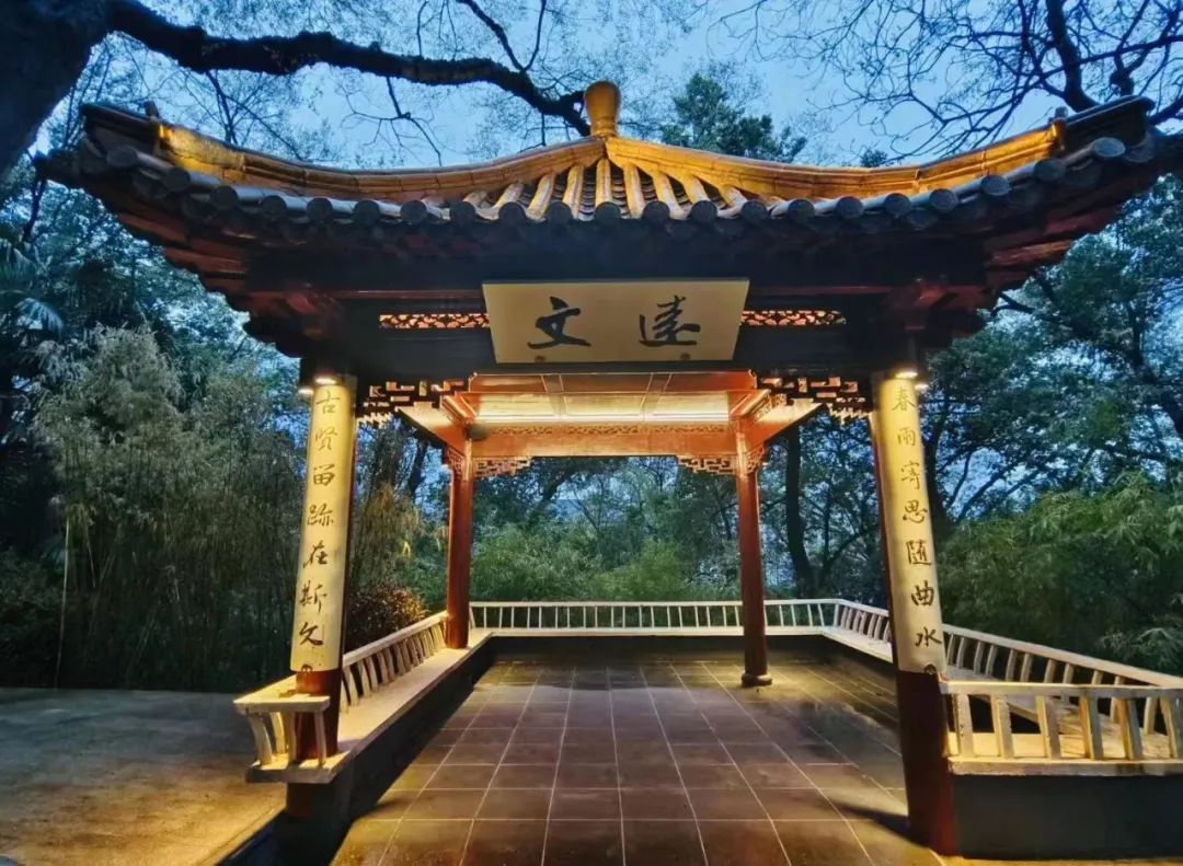 继续往前走,来到文思亭,开始“进入”唐宋。这里集中表现了李白、杜牧等诗词名家留下的名篇名句。“文学声景”利用亭子与平台空间层层嵌套,慢行中,偶尔听见唐宋诗词吟诵,让人感觉“出庭又未出庭”,同时叠加的动态鸟声,带来独特体验——诗词吟诵声中,仿佛鸟在庭间穿越。扫描文思亭导览牌上的李白妙笔生花笺谱,手机屏还会跳出“笔花”。