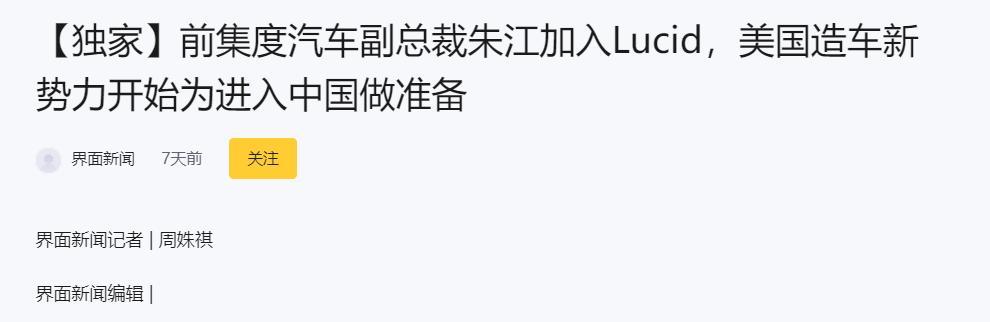 「独家」前集度汽车副总裁朱江加入Lucid,美国造车新势力开始为进入中国做准备 - 界面新闻