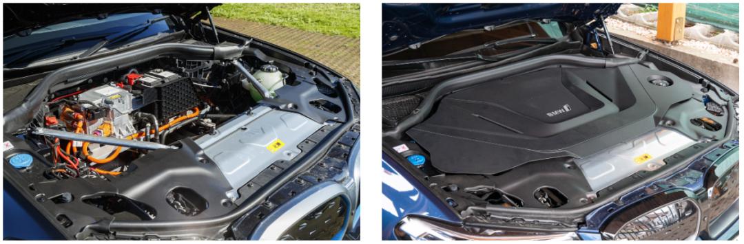电车界其实一直有着 “ 前备箱越大车越好 ” 的说法。在车头也就是油车发动机舱的位置,大部分电车的做法是把一些管路和逆变器之类的东西一股脑塞进去,然后用一块塑料板盖上完事。