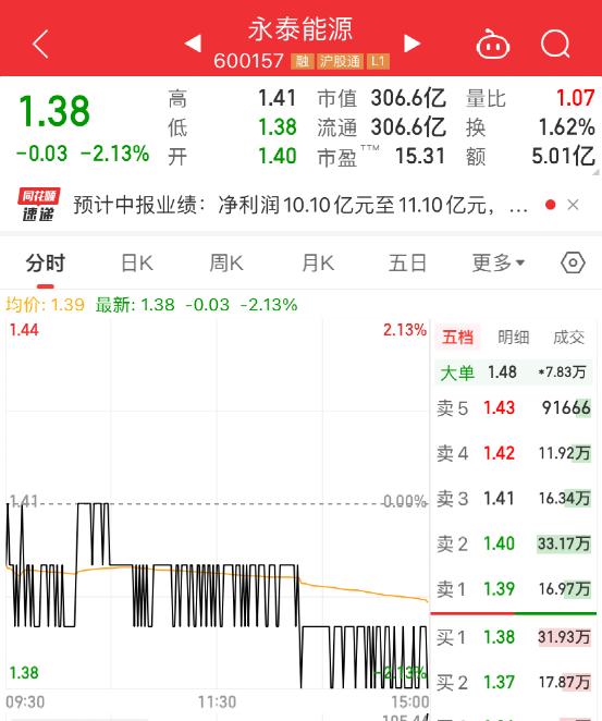 永泰能源公司主要从事煤炭、电力、石化、储能等能源产业,主营业务形成了煤电互补的综合能源经营格局。最新股价收报1.38元,总市值307亿元。