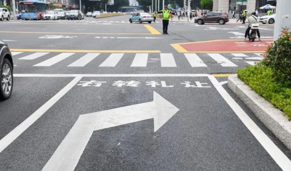 右转车道进口道和斑马线前都施划了“右转礼让”文字标识,明确右转车辆要主动让行。利用多组文字提示,明确右转让行,实现兼顾安全和效率最大化。
