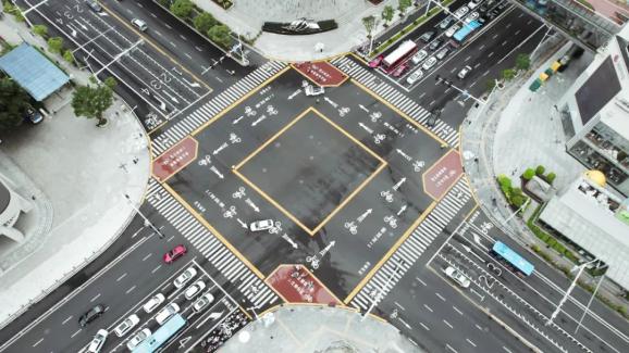 逆时针方向设置非机动车信号灯和带倒计时的非机动车通行引导屏,进一步明晰非机动车通行信号指示。市民根据逆时针方向设置的