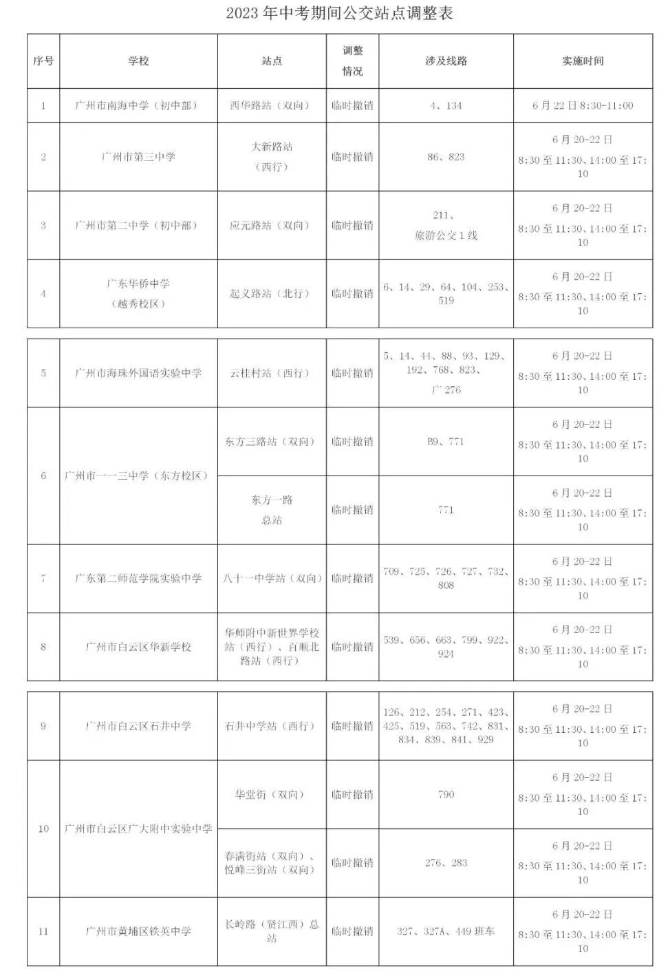 广州市2023年初中学业水平考试将于6月20至22日进行。为确保考试期间市内各考场的考试环境良好,经研究,决定临时调整考场附近部分公交站点及线路。现将有关事项告示如下: