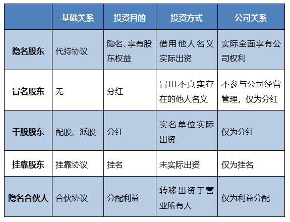 为准确理解隐名股东的含义,我们需要对比与隐名股东相近的几个概念,详见下表 ① :