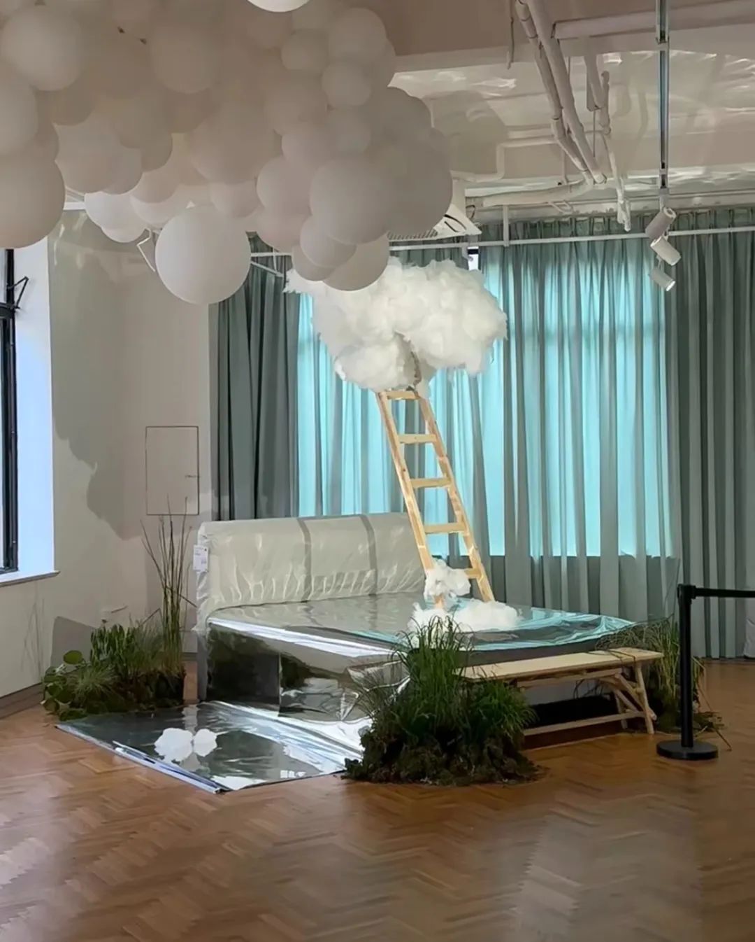 白色的气球云朵,床上有通往云层的梯子,云朵中的蝴蝶镜,还有艺术家的大幅梦幻画作,打造出现实的梦境。在喧嚣的都市生活中,为我们提供了一个暂时搁置烦恼的空间。