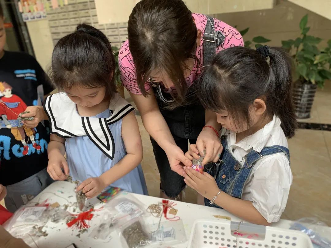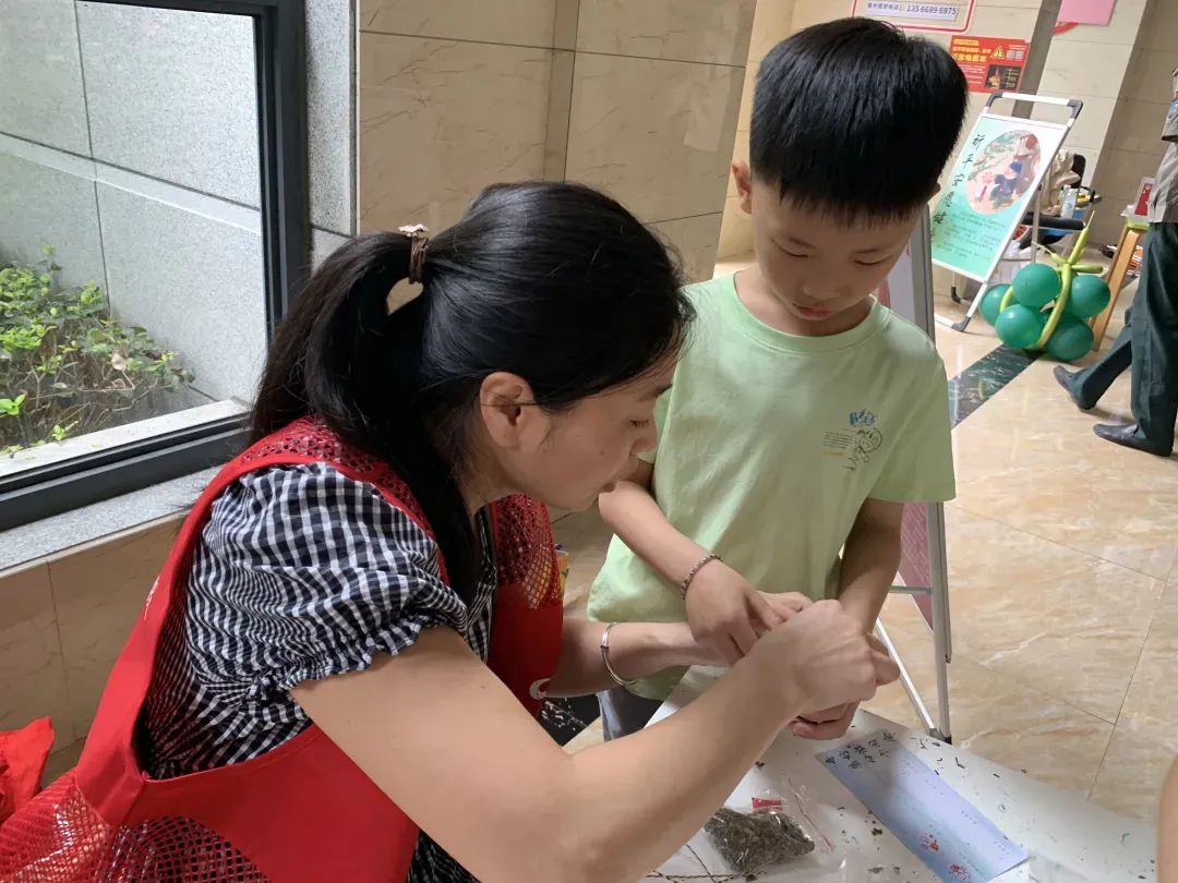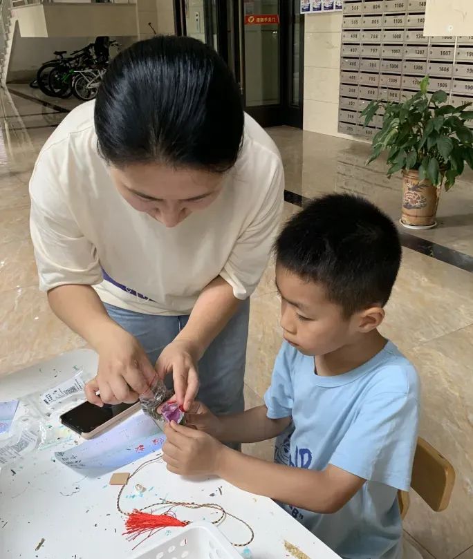 巧手制香囊,随香入端午。志愿者向居民介绍“佩香囊”习俗。小朋友和家长一起分工合作,制作一个图案各异、色彩斑斓的香囊。