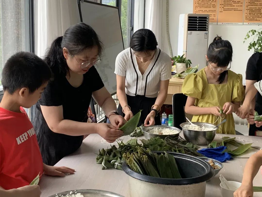 一捧糯米,三两粽叶,家长们一包一捆间,一只又一只饱满、紧实的粽子跃于桌案上。孩子们十分地新奇和兴奋,纷纷都要尝试自己来包一包。摘叶飞花