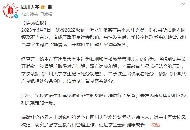 昨日,@四川大学 发布情况通报:2023年6月7日,我校2022级硕士研究生张某在其个人社交账号发布其所拍他人视频及不当言论,造成严重不良社会影响。事情发生后,学校密切联系事发地警方和当事学生沟通了解情况,并就相关问题开展调查核实。>>>查看详情