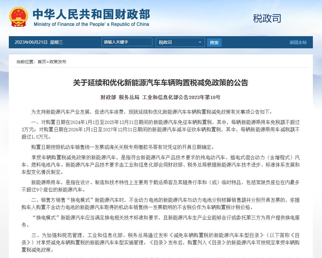 近日,财政部、税务总局、工业和信息化部发布了“关于延续和优化新能源汽车车辆购置税减免政策的公告”,全文如下: