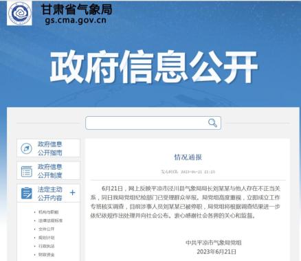 中共平凉市气象局党组发布通报:6月21日,网上反映平凉市泾川县气象局局长刘某某与他人存在不正当关系,同日我局党组纪检部门已受理群众举报。局党组高度重视,立即成立工作专班核实调查,目前涉事人员刘某某已被停职,局党组将根据调查结果进一步依纪依规作出处理并向社会公布。