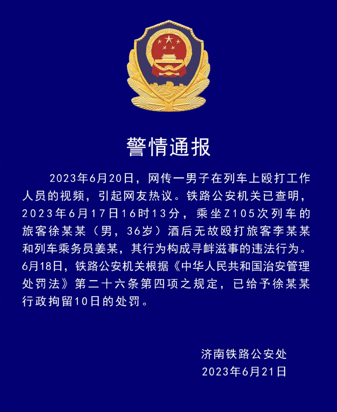@济南铁警 发布警情通报:2023年6月20日,网传一男子在列车上殴打工作人员的视频,引起网友热议。铁路公安机关已查明,2023年6月17日16时13分,乘坐Z105次列车的旅客徐某某(男,36岁)酒后无故殴打旅客李某某和列车乘务员姜某,其行为构成寻衅滋事的违法行为。6月18日,铁路公安机关根据《中华人民共和国治安管理处罚法》第二十六条第四项之规定,已给予徐某某行政拘留10日的处罚。