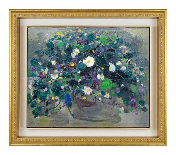作于1992年的《花卉》正是此一时期佳作。此作介于抽象与具象之间,似是而非而又明艳动人,是对二十年前故园旧梦的回忆,也流露出对于下一个人生阶段的展望,作品中华丽的表现性色彩和多元化的笔触则隐隐预示了吴冠中晚期油画创作中的纯粹抽象倾向。